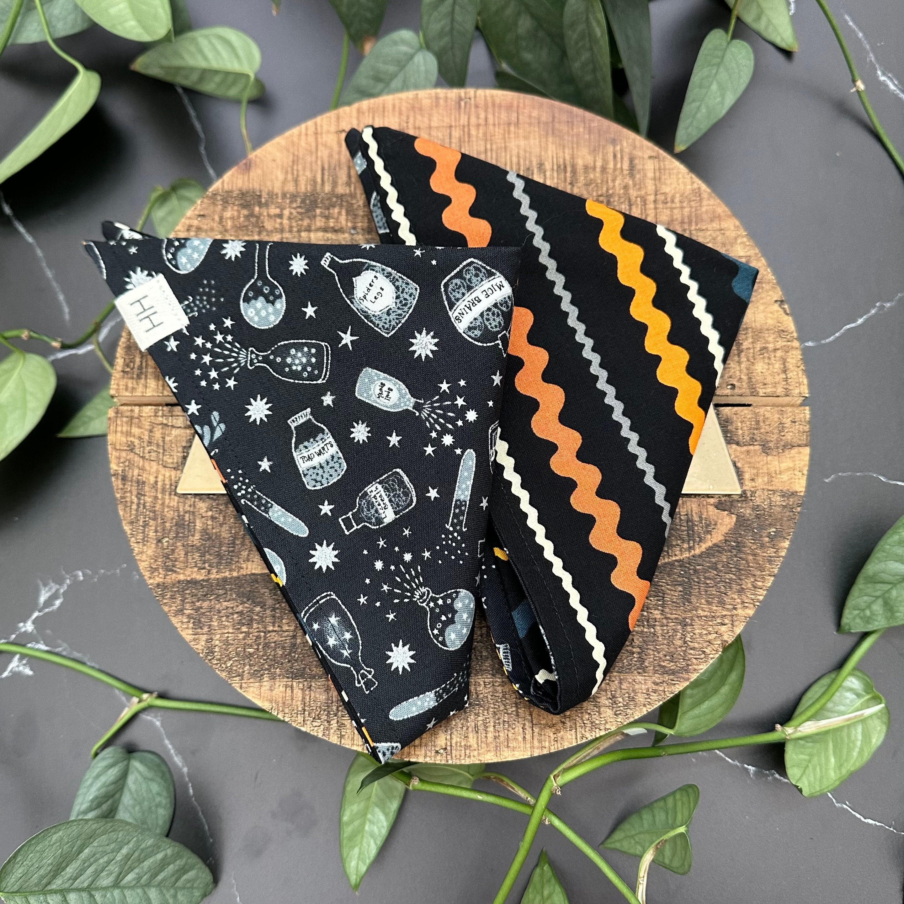 Sizing: Use a soft tape measure to measure in inches around the widest part of your dog’s neck, or collar. If in between sizes, or if your animal has fluffy fur, we suggest sizing up. Bandanas can also be rolled over if too big. If you have any questions on sizing please reach out and we will lead you in the right direction.