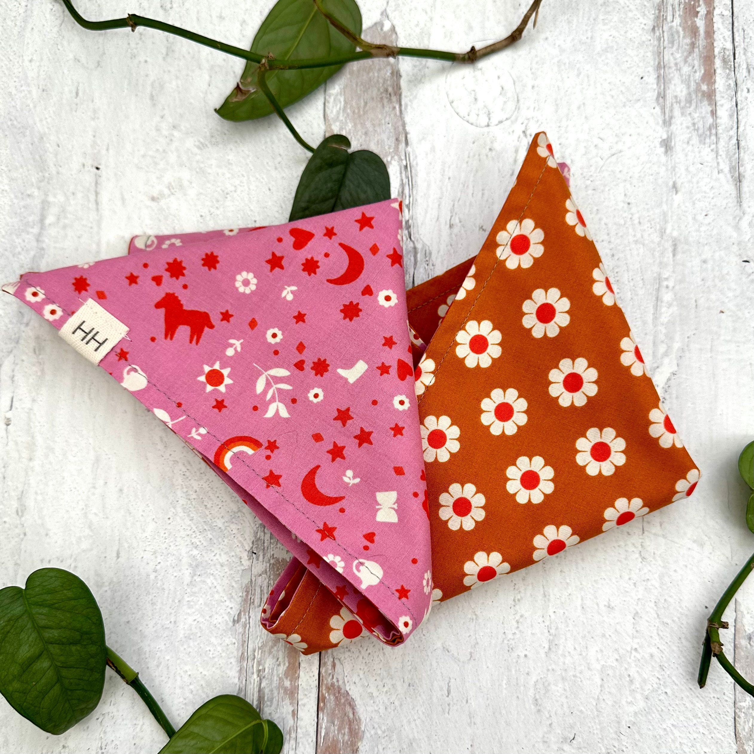 Sizing: Use a soft tape measure to measure in inches around the widest part of your dog’s neck, or collar. If in between sizes, or if your animal has fluffy fur, we suggest sizing up. Bandanas can also be rolled over if too big. If you have any questions on sizing please reach out and we will lead you in the right direction.