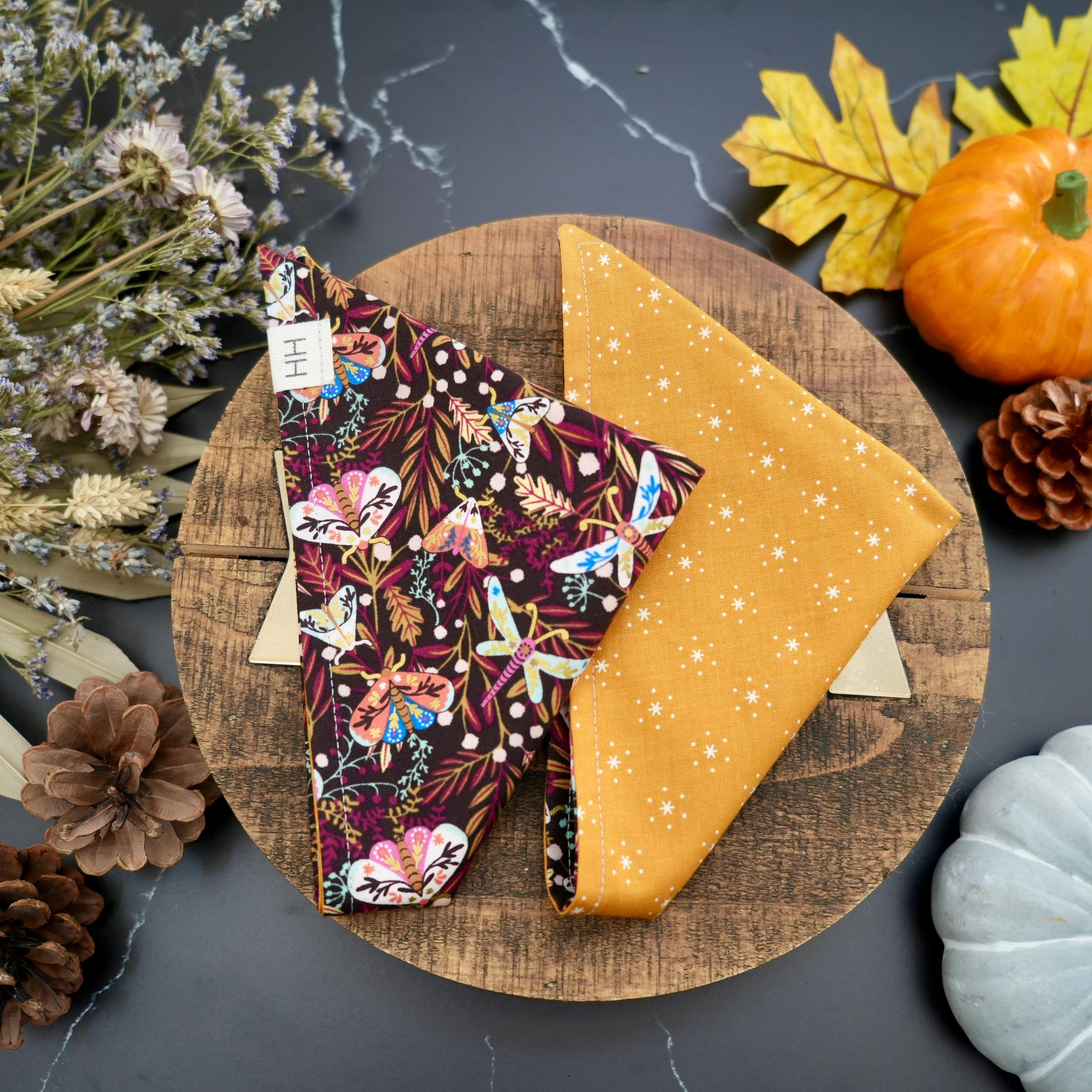 Sizing: Use a soft tape measure to measure in inches around the widest part of your dog’s neck, or collar. If in between sizes, or if your animal has fluffy fur, we suggest sizing up. Bandanas can also be rolled over if too big. If you have any questions on sizing please reach out and we will lead you in the right direction.