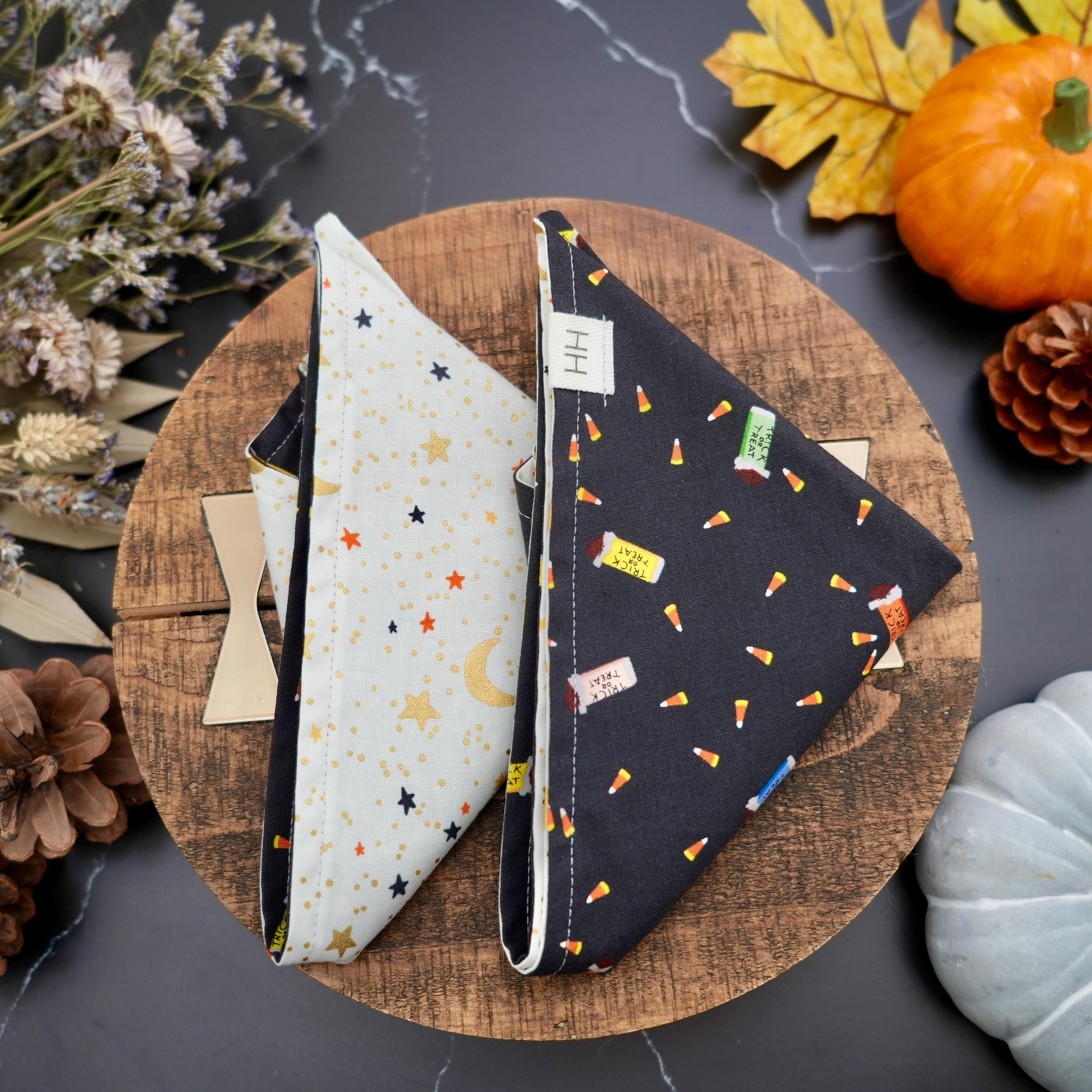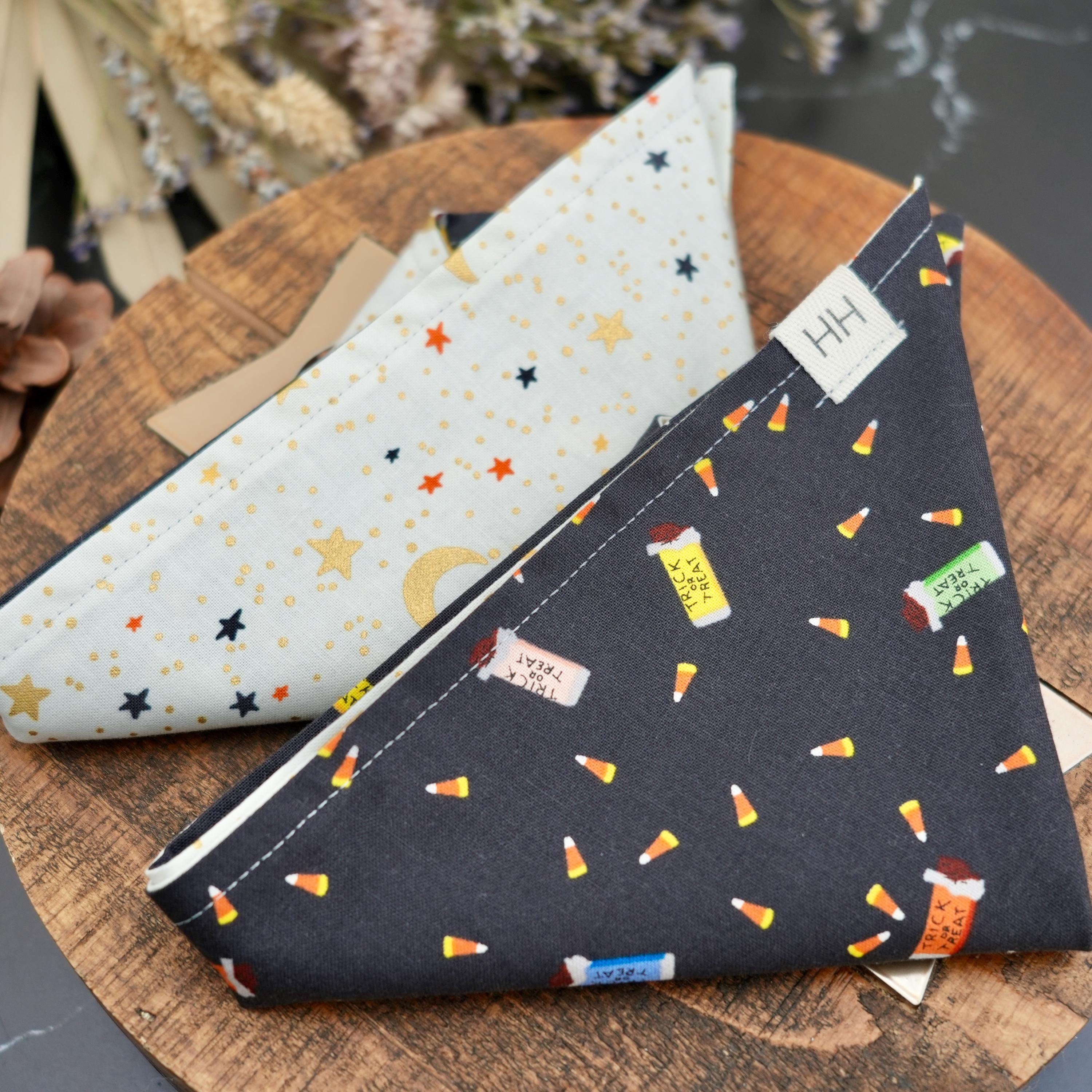 Sizing: Use a soft tape measure to measure in inches around the widest part of your dog’s neck, or collar. If in between sizes, or if your animal has fluffy fur, we suggest sizing up. Bandanas can also be rolled over if too big. If you have any questions on sizing please reach out and we will lead you in the right direction.